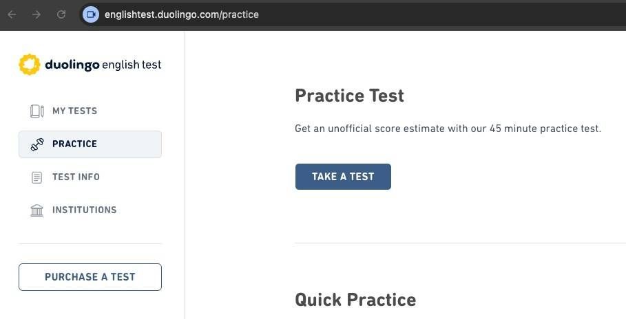 TESTE DUOLINGOObs.: Crie uma conta na plataforma e utilize a versão gratuita do teste, "TAKE A TEST" na aba PRACTICE, conforme imagem abaixo. (utilize o browser Chrome)